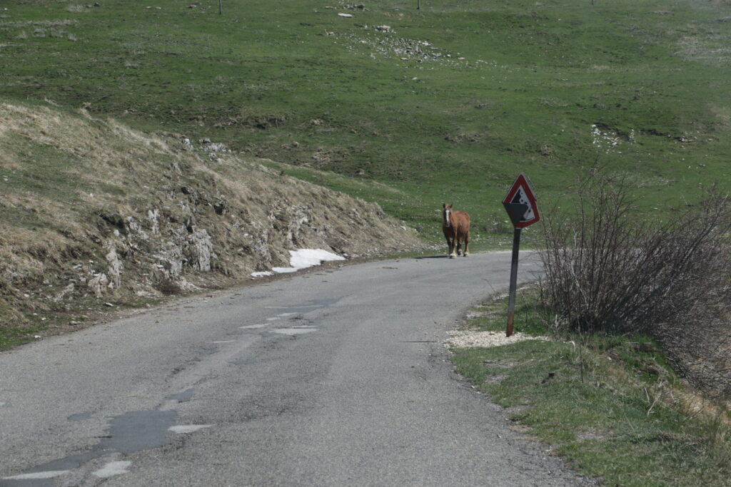 Am Ortsausgang war links ein Stall mit ein paar lieb dreinblickenden Eseln und einige Kurven später kam der Abzweig nach Castelluccio und dem Piano Grande – nur war die Straße halbseitig gesperrt. Ein Schild besagte, dass nur die Polizei, Hilfsorganisationen und Sicherheitsdienste durchfahren dürften (frana = Erdrutsch):