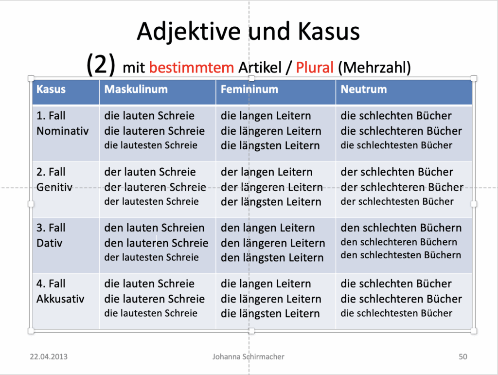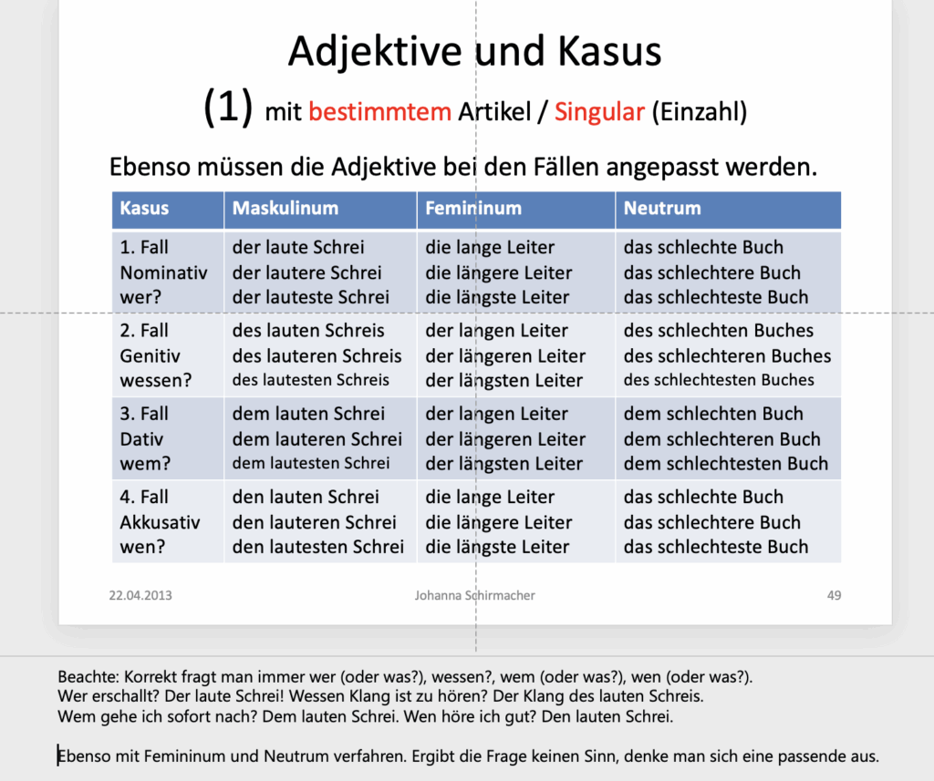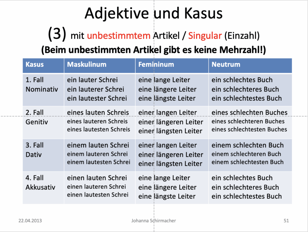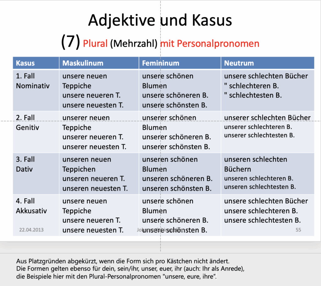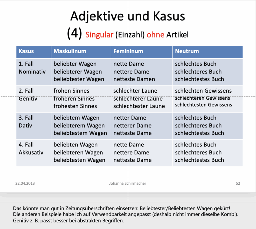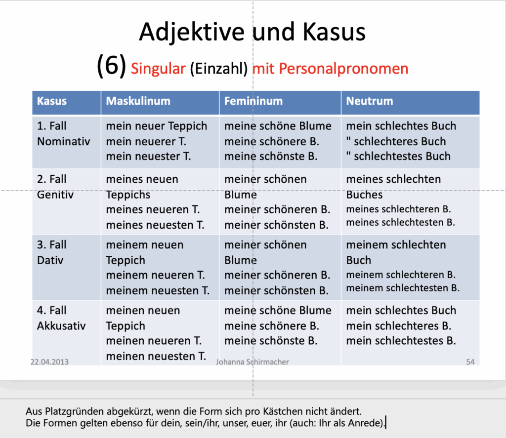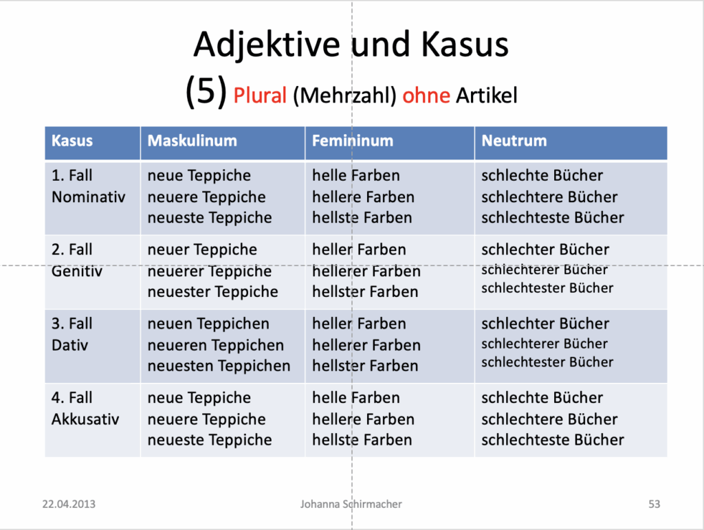Die Adjektive müssen dem Substantiv in Genus und Numerus und je nach Fall (Nominativ, Genitiv, Dativ, Akkusativ) angepasst werden. Um die jeweiligen Formen zu lernen, kann man das Internet fragen nach „Deklination von Nomen / Adjektiven“ – es gibt etliche Seiten mit Informationsmaterial. Ich habe mir den Spaß gemacht, selber ein paar Tabellen zu entwickeln. Fangen wir mal mit den Adjektiven an. Wer sich unsicher ist, kann sich anhand dieser Tabellen helfen und die Wörter einfach austauschen.